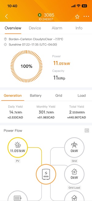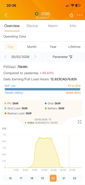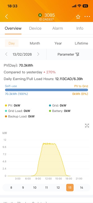 • Sunny winter days: 70–75 kWh → saving ~$12 in a single day